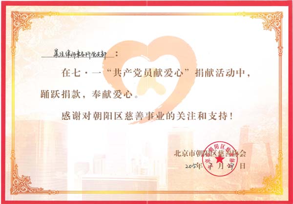 為充分發揮共產黨員的先鋒模范作用,集佳律師事務所積極響應朝陽區律協開展的“共產黨員獻愛心活動”,在活動中積極踴躍的奉獻自己的愛心,得到了朝陽律協黨政的肯定與贊揚。集佳黨員將繼續發揮模范作用并堅持為社會做貢獻。