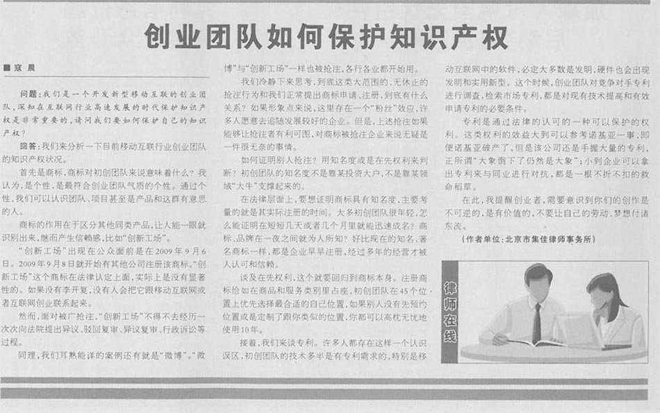 集佳代理人撰文《創(chuàng)業(yè)團(tuán)隊(duì)如何保護(hù)知識(shí)產(chǎn)權(quán)》在《中國貿(mào)易報(bào)》發(fā)表