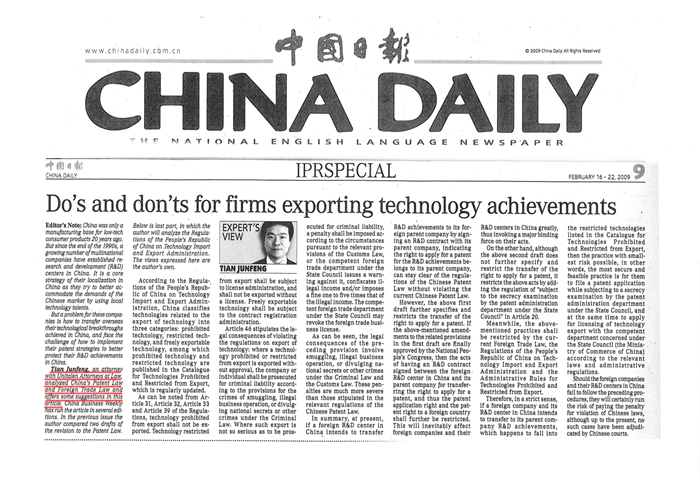 《CHINA DAILY》:Do's and dont's for firms exporting technology achievements