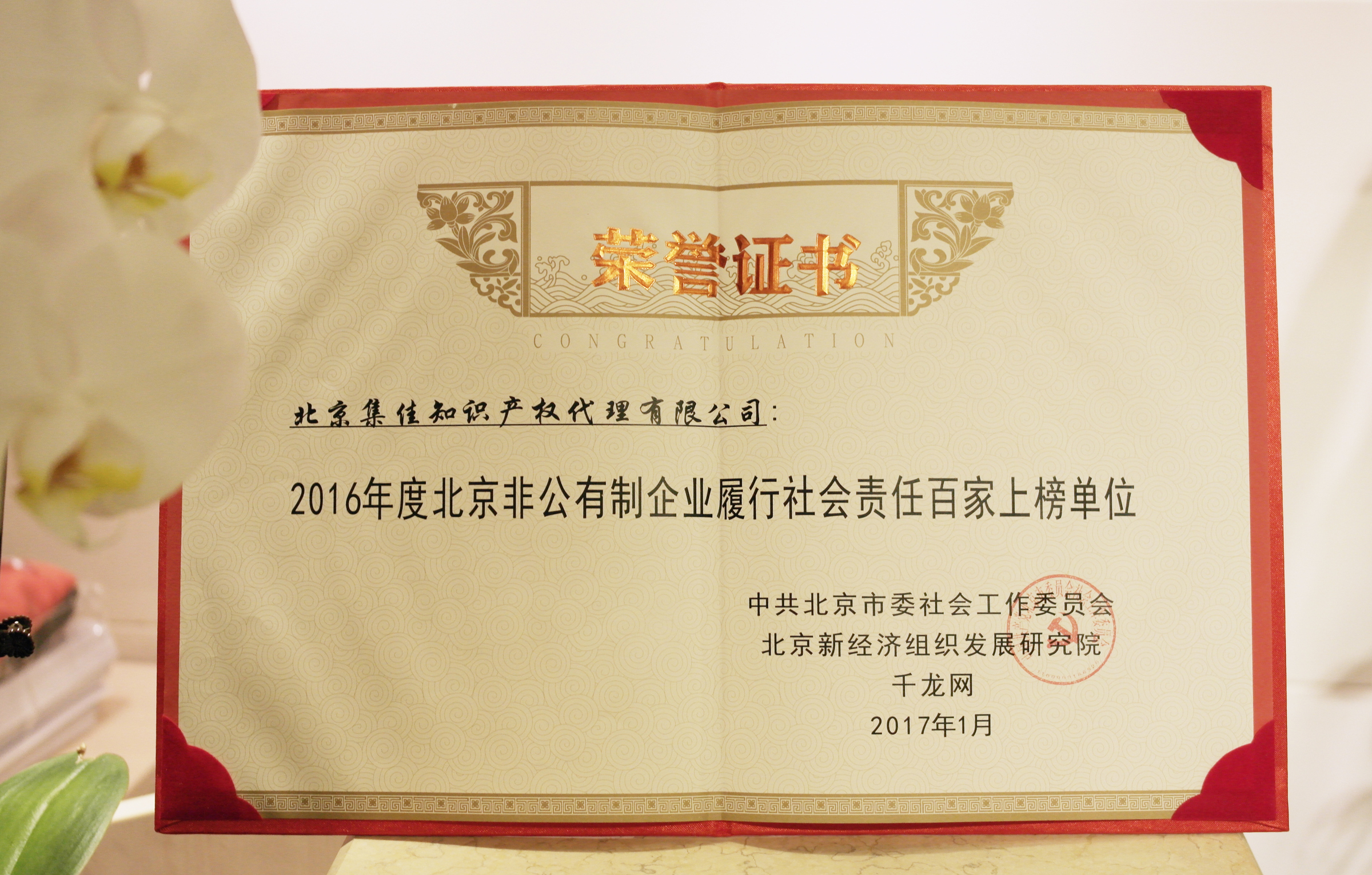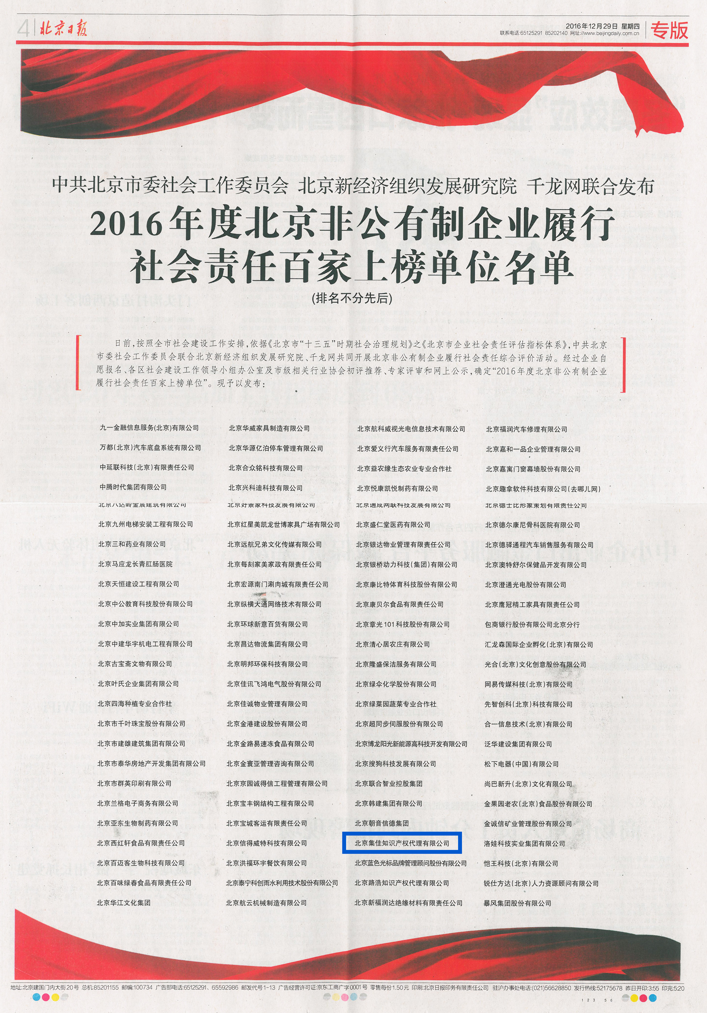 1月7日上午,由北京市委社會工委、北京新經(jīng)濟(jì)組織發(fā)展研究院、千龍網(wǎng)聯(lián)合組織的第二屆新經(jīng)濟(jì)組織發(fā)展高峰論壇暨首屆北京非公有制企業(yè)履行社會責(zé)任百家上榜單位發(fā)布會在首都經(jīng)貿(mào)大學(xué)隆重舉行,會上,北京集佳知識產(chǎn)權(quán)代理有限公司等100家履行社會責(zé)任表現(xiàn)突出的非公企業(yè)受到表彰。此前,《北京日報》整版刊發(fā)了百家上榜企業(yè)名單。