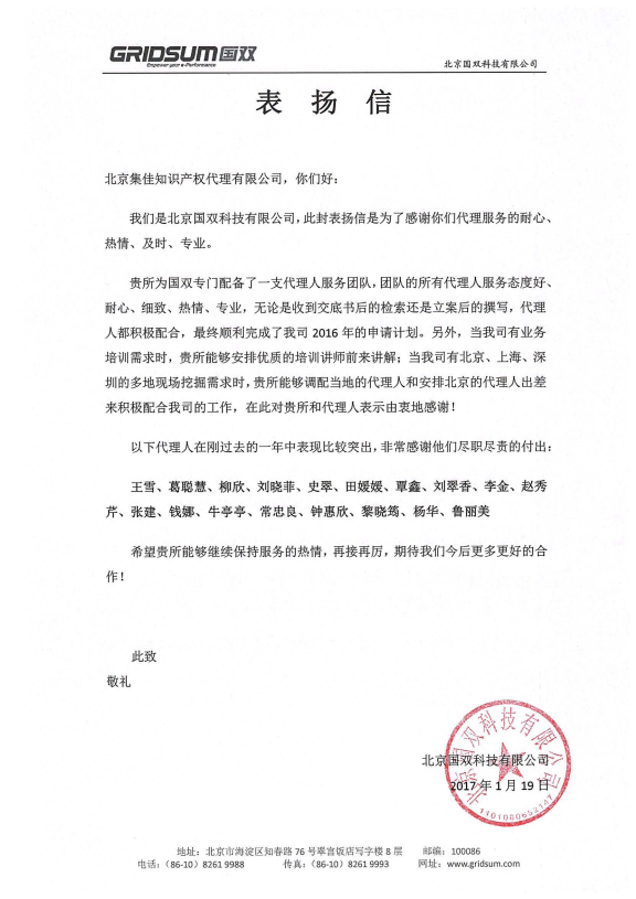 •   本次發來表揚信的是北京國雙科技有限公司,信中,客戶對楊五、王寶筠等專業人員的辛勤付出表示感謝,對集佳專業高效的服務、一絲不茍的工作態度表示認可。