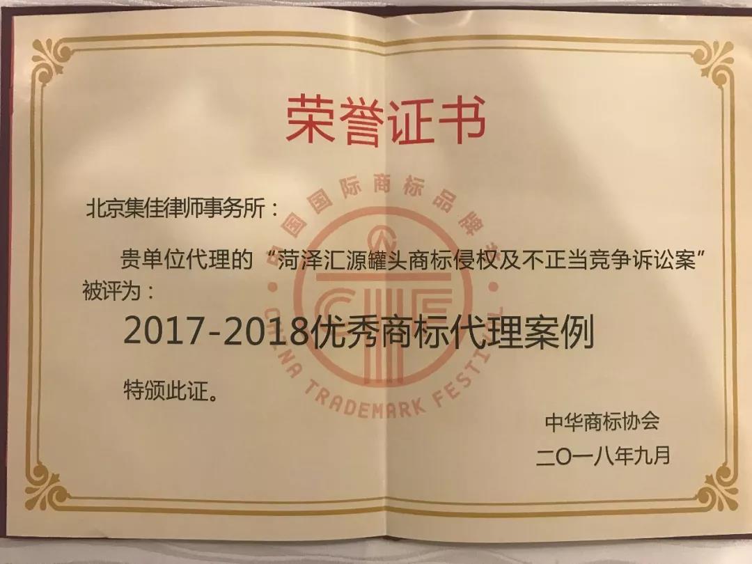 2018中國國際商標品牌節(jié)進行到第二日,又一令人期待的獎項頒布了。中華商標協(xié)會梳理和回顧了過去一年商標領(lǐng)域發(fā)生的重大典型事件、案件,從參加申報的眾多商標代理案例中評選出了26件年度商標典型案例,以此樹立優(yōu)秀案例標桿,發(fā)揮示范指導效應(yīng)。集佳律師事務(wù)所代理的“菏澤匯源罐頭商標侵權(quán)及不正當競爭訴訟案”成功入選“2017-2018優(yōu)秀商標代理案例”。