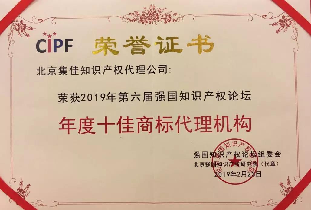 會上,強國知識產權論壇組委會對“2019強國知識產權論壇服務業‘十佳’進行了頒獎。組委會以“創新、協調、開放、共享”發展理念為指導,以“責任、創新、挑戰”為關鍵詞,以“創新力、影響力、發展力、經營力”為評選標準,評選出2018年度在知識產權領域商標、專利和法律服務各方面做出突出貢獻的優秀機構和個人。集佳以較強的專業服務水平、領先的實踐成果、前瞻的發展理念和創新的經營思維獲得好評,入選“年度十佳商標代理機構”。