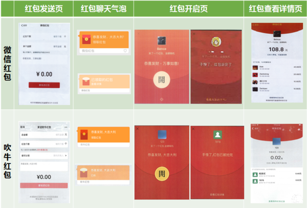 本案緣于被訴“吹牛”軟件在提供的紅包收發服務過程中,在紅包發送接收全過程中使用的紅包發送頁、開啟頁、聊天氣泡、查看詳情頁等界面全面抄襲、模仿原告“微信紅包”相關界面。此外“吹牛”軟件中還提供與騰訊公司享有在先著作權的六幅“微信表情”一致的聊天表情,且其使用與“微信”軟件底部界面“聊天、通訊錄、發現、我”圖標高度近似的圖標。