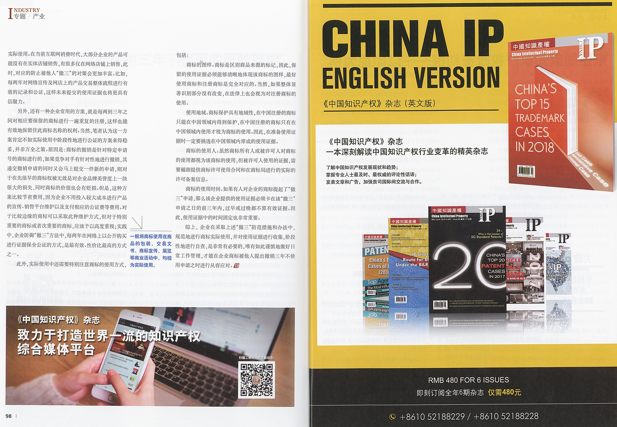 集佳文章《企業(yè)經(jīng)營中商標(biāo)撤銷三年不使用的風(fēng)險管控》在《中國知識產(chǎn)權(quán)》 發(fā)表