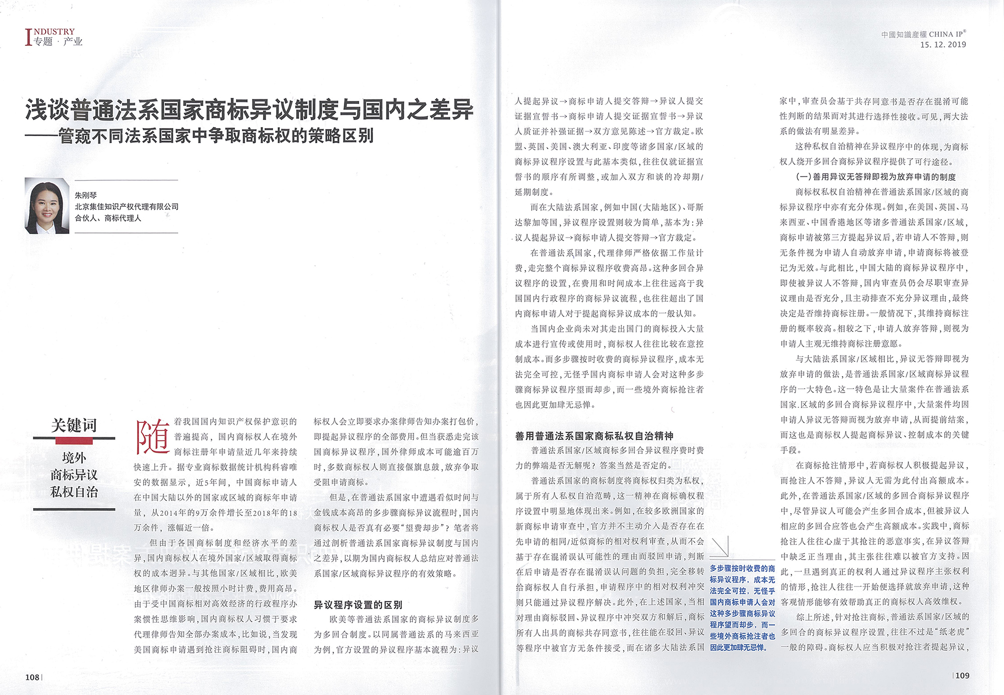 集佳文章《淺談普通法系國家商標異議制度與國內之差異——管窺不同法系國家中爭取商標權的策略區別》在《中國知識產權》發表