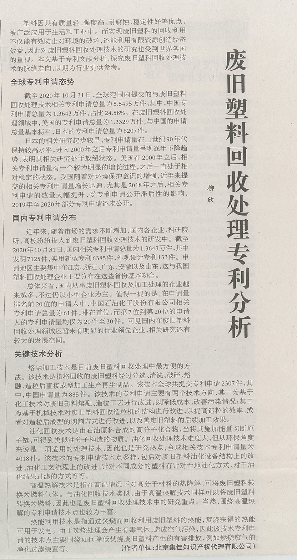 集佳文章《廢舊塑料回收處理專利分析》在《中國知識產權報》發表
