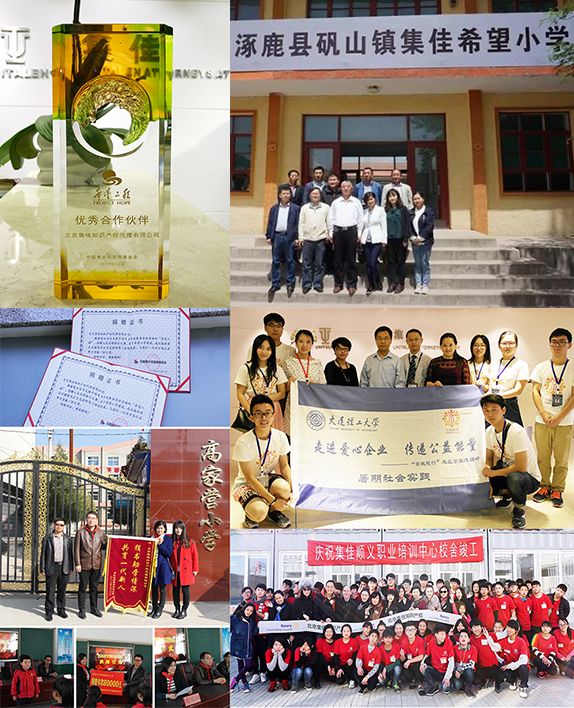 責任于心,擔當于行。作為一家有溫度的企業,集佳在用心為企業提供知識產權保護策略的同時,也一直自覺承擔各項社會責任,熱心參與各項公益事業,發揚行業擔當精神,堅持不懈用愛心回饋社會。尤其是在教育領域,集佳不僅重視專業人才培養,通過愛心獎學金、集佳班、提供社會實踐等方式與中國政法大學、同濟大學、大連理工大學等眾多高校合作培養知識產權專業人才,更是特別關注青少年的教育和成長。目前,集佳已援建13所希望小學,并多次進行回訪,持續關注孩子們的學習和成長,了解學校和孩子們的真實所需,提供最有效的幫助。同時,集佳設立了多項助學基金,對多所小學、中學、技術學校等提供幫扶。集佳期望,通過一點一滴的幫助,讓孩子們的生活和學習更加豐富多彩,讓他們感受著愛的力量,懷抱希望,用優異的學業報效祖國,用同樣的關愛回報社會。