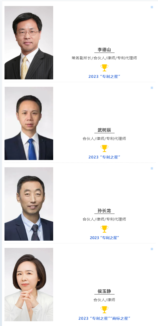 同時,李德山副所長、武樹辰律師、孫長龍律師和侯玉靜律師因其在各自領(lǐng)域的卓越實力和杰出表現(xiàn),分別獲評2023 IP Stars“專利之星”“商標之星”美譽。