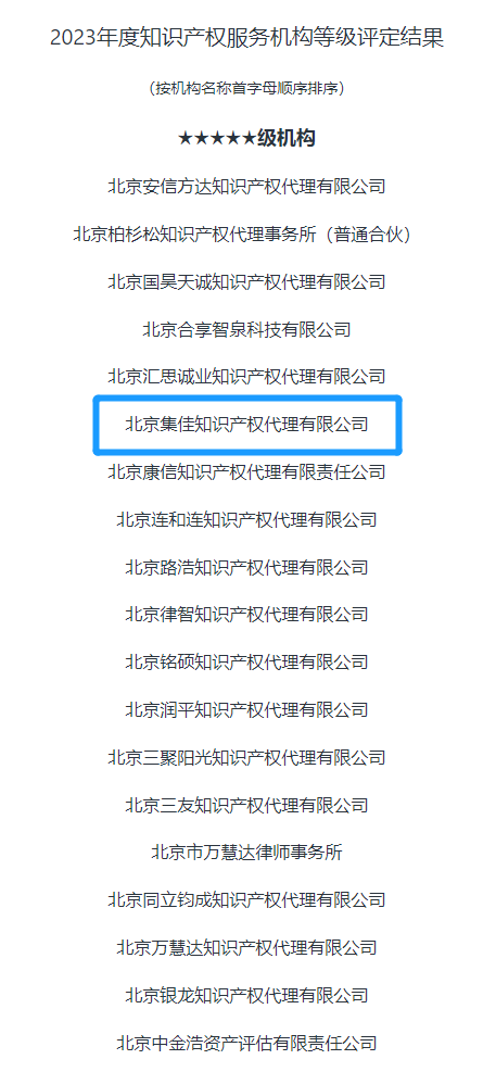 2024年2月4日,首都知識產權服務業協會公布2023年度知識產權服務機構等級評定結果,北京集佳知識產權代理有限公司憑借穩健的綜合實力獲得各界肯定,獲評首批最高等級——AAAAA級知識產權服務機構。