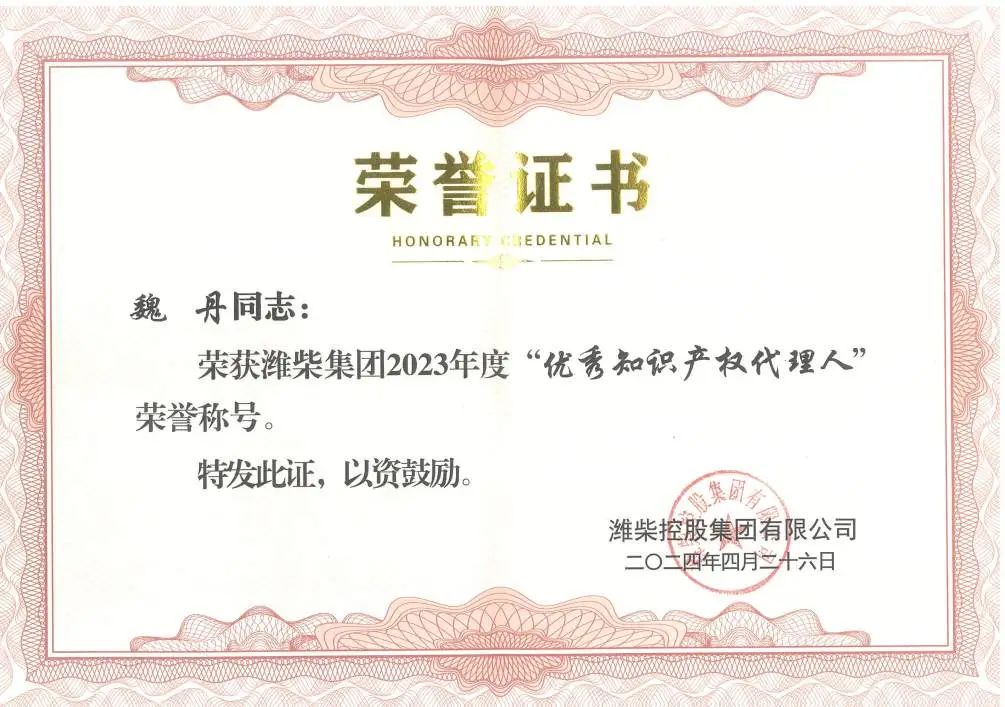 同時(shí),濰柴集團(tuán)授予集佳專利代理師陳志海、魏丹2023年度“優(yōu)秀知識(shí)產(chǎn)權(quán)代理人”榮譽(yù)稱號(hào),對(duì)他們精湛的業(yè)務(wù)能力與認(rèn)真負(fù)責(zé)的專業(yè)態(tài)度點(diǎn)贊!