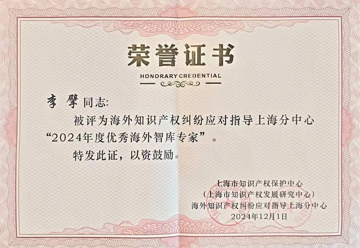 集佳上海分所合伙人李擘律師憑借在海外知識產權爭議糾紛解決領域的卓越能力及客戶的認可,被評為海外知識產權糾紛應對指導上海分中心“2024年度優秀海外智庫專家”。