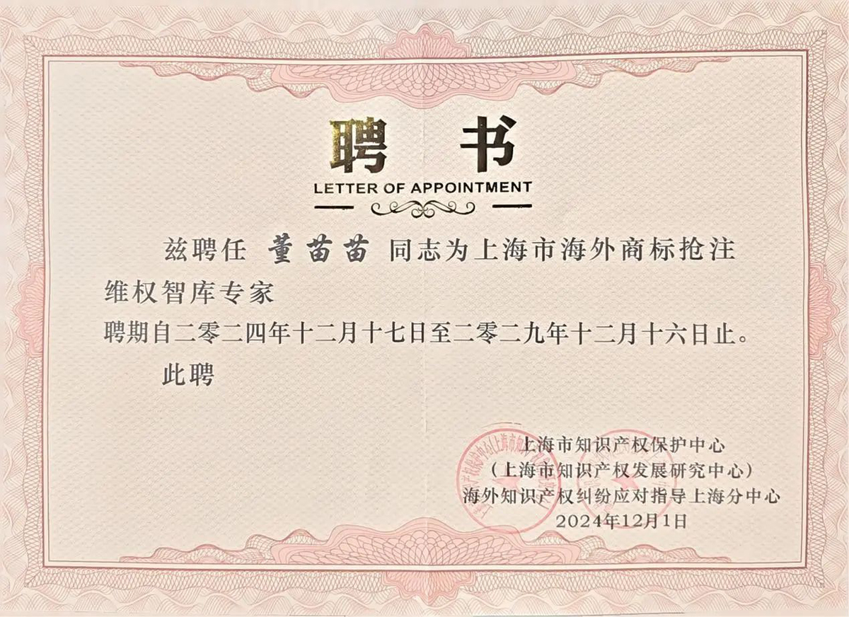 董苗苗律師從眾多候選人中脫穎而出,被聘任為上海市海外商標搶注維權智庫專家